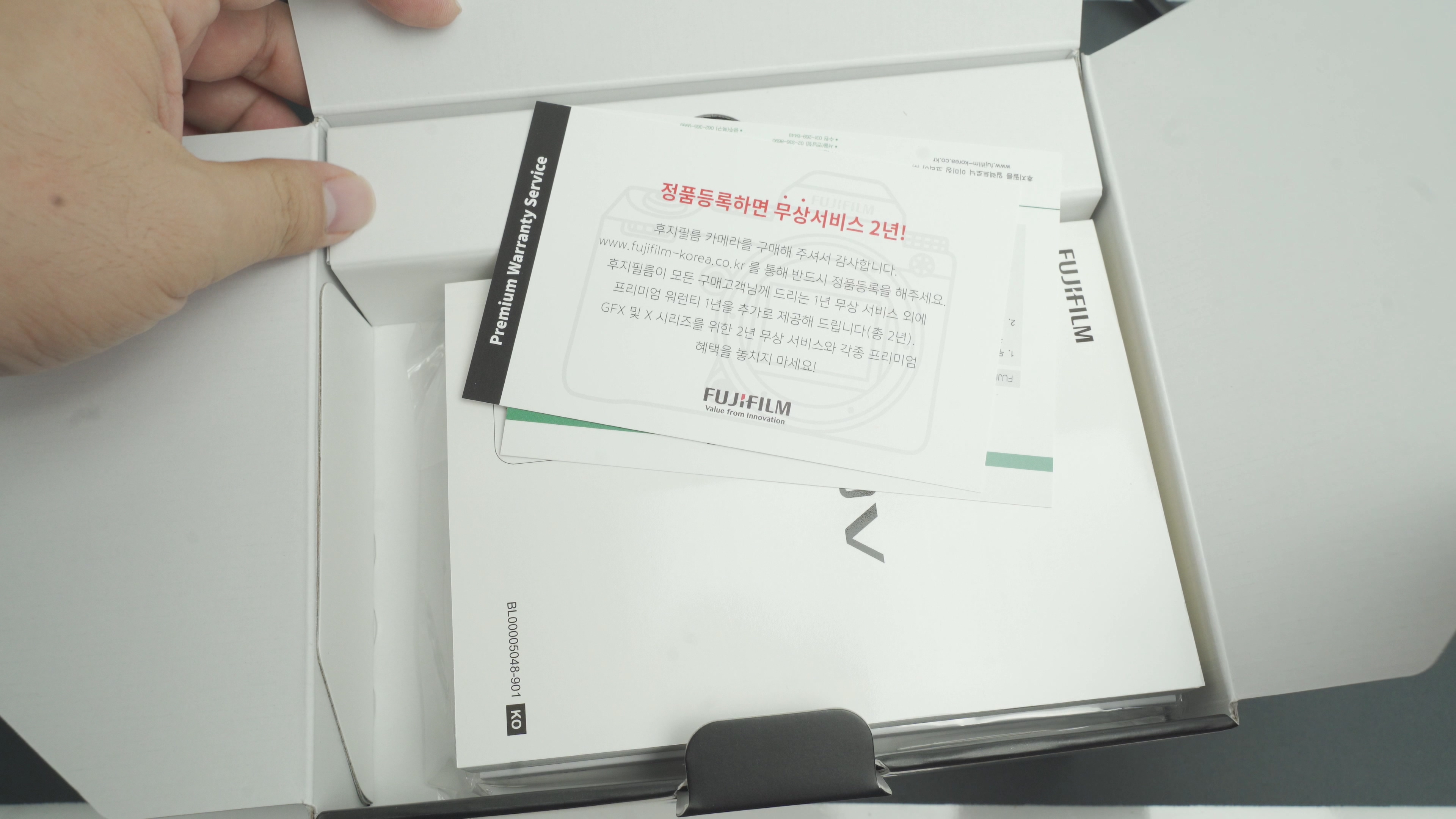 후지필름 특유의 박스죠. x100v 는 프리미엄 똑딱이기 때문에 뭔가 더 믿음직하게 생겼어요 박스가.